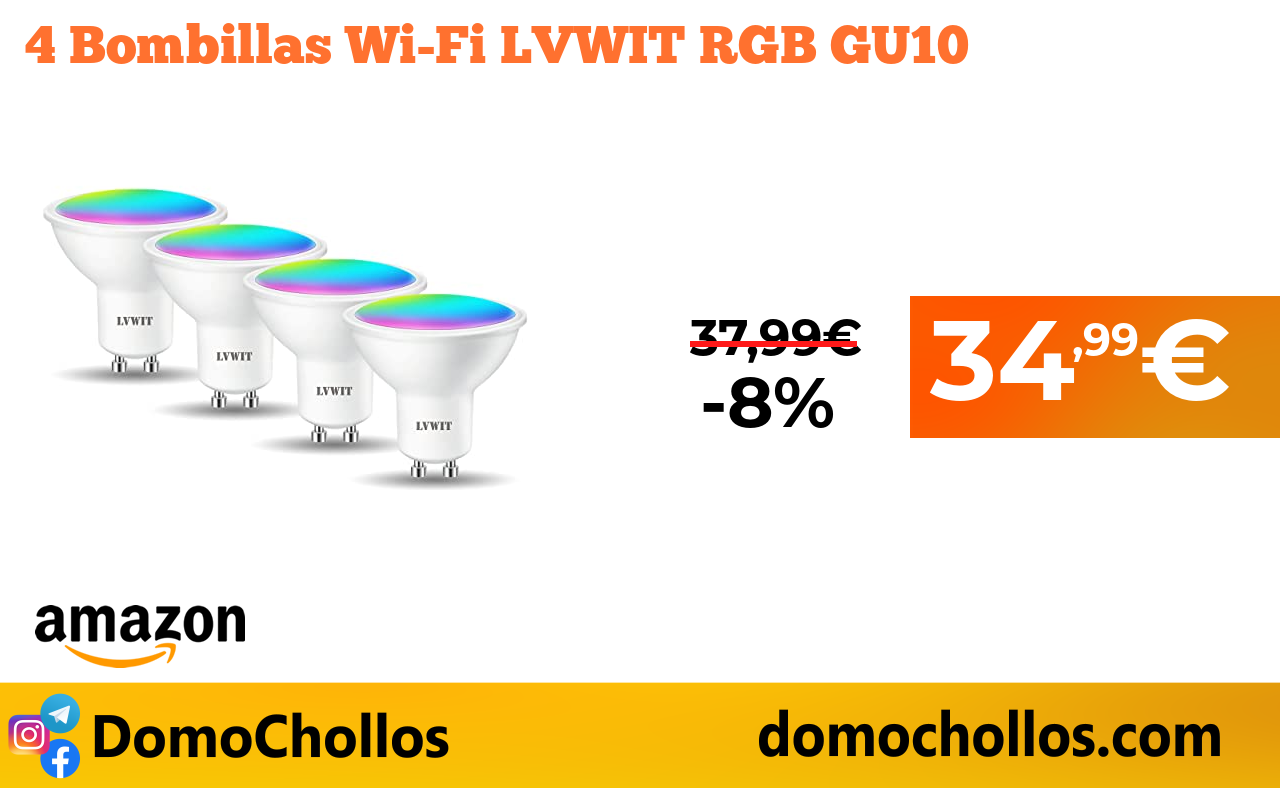 ❇ 4 Bombillas Wi-Fi LVWIT RGB GU10
