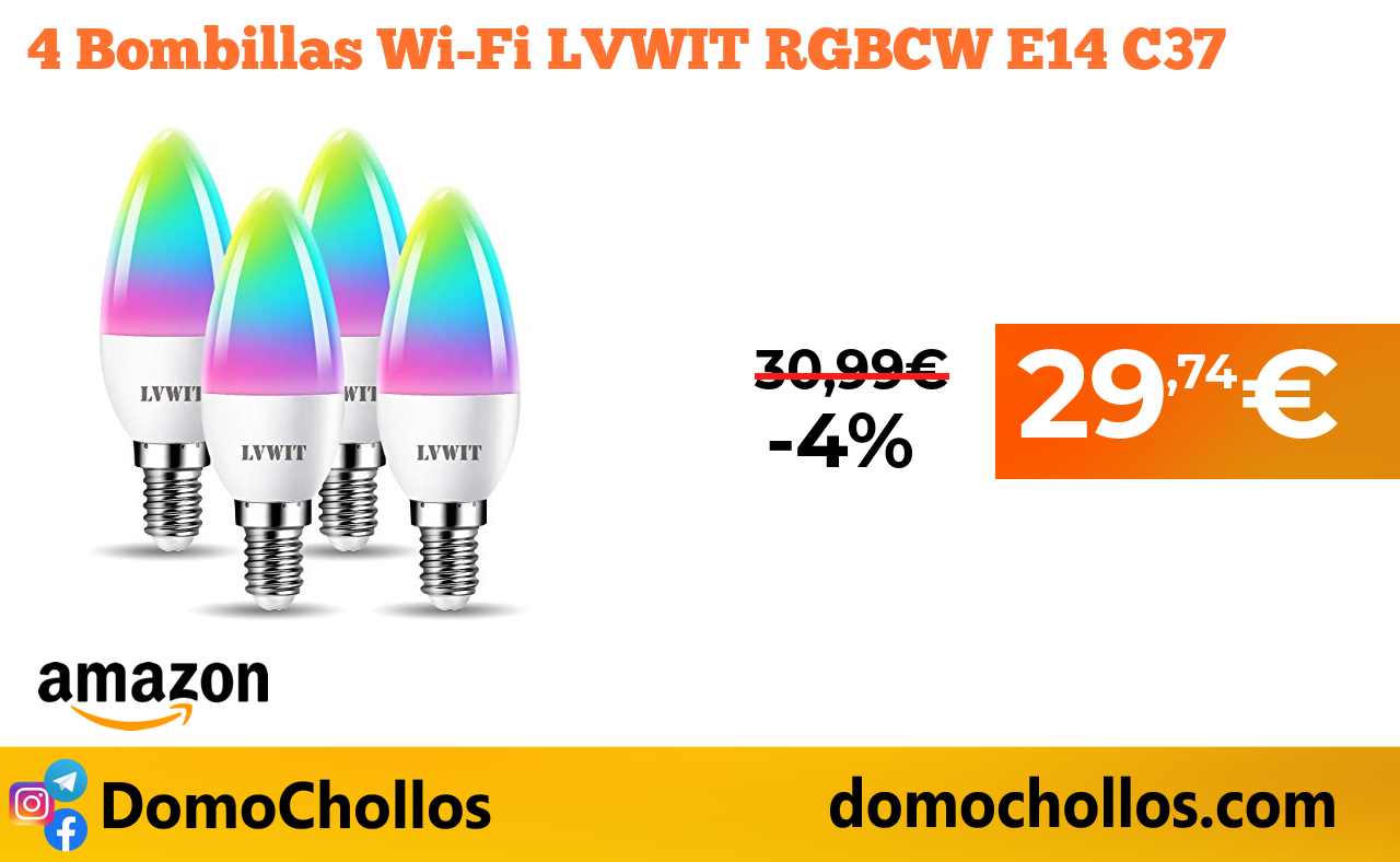❇ 4 Bombillas Wi-Fi LVWIT RGBCW E14 C37